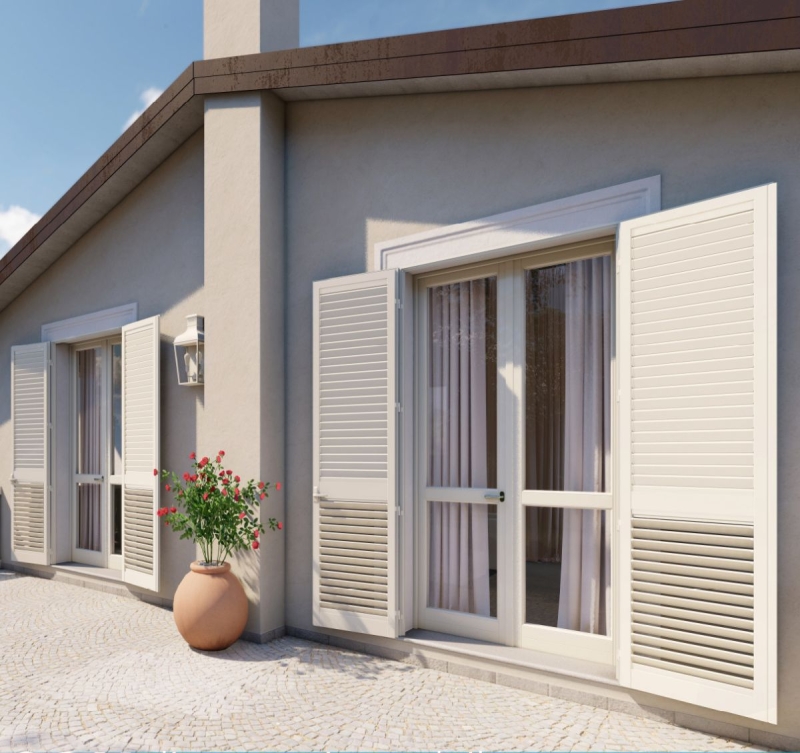 Ampia gamma di soluzioni per persiane in alluminio con telaio, a murare o a libro, nelle varianti a stecca fissa, a stecca orientabile e con sportello gelosia, con una vasta gamma colori tra cui scegliere.